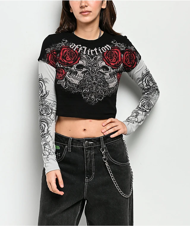 Affliction Forgotten Black & Grey 2fer Long Sleeve Crop T-Shirt