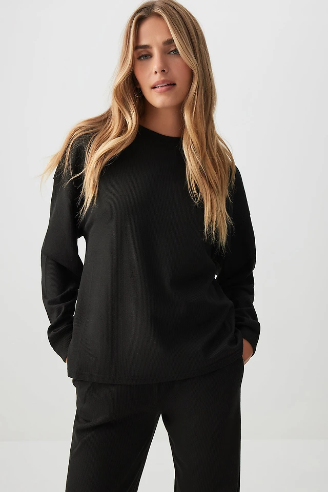 Ardene Oversized Waffle Knit Sweatshirt in Black | Size | Polyester/Spandex