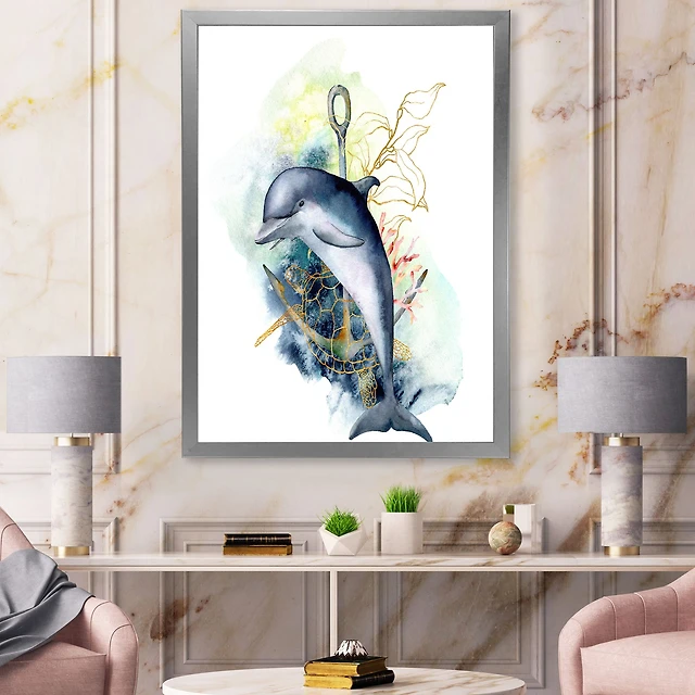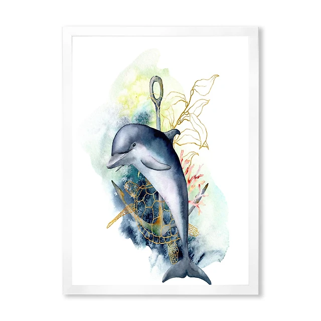 Dolphin Turtle Anchor & Linear Coral Reef Plants Canvas Wall Art Print