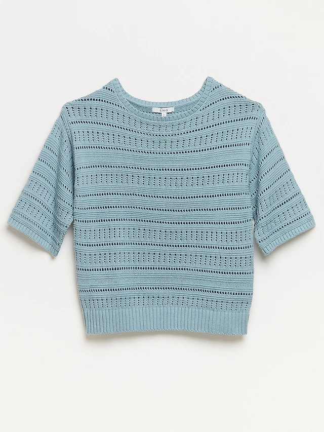 Short Sleeve Blue Crochet V-Neck T-Shirt
