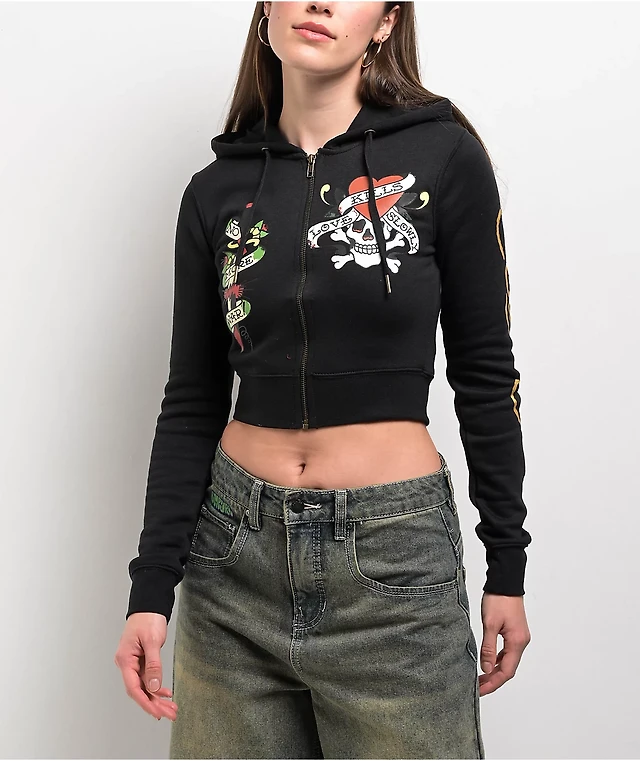 Ed Hardy Tiger Head Black Velour Crop Zip Hoodie