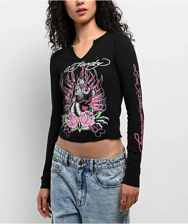 Ed Hardy Panther Roses Black Notch Thermal Long Sleeve T-Shirt