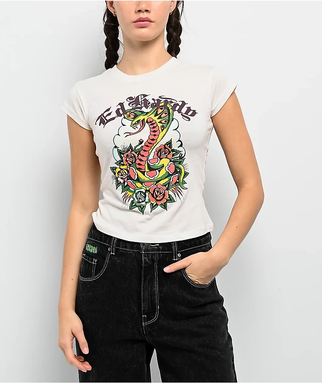 Ed Hardy Rose Cobra Ivory Crop T-Shirt