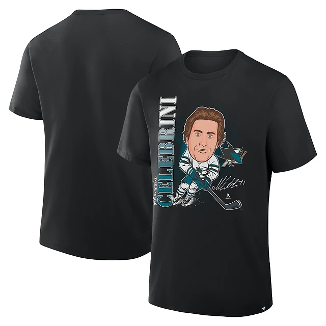 Men's Fanatics Macklin Celebrini Black San Jose Sharks Caricature Player T-Shirt