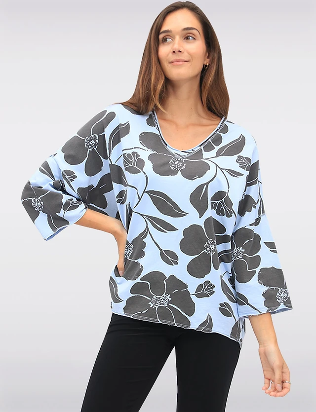 Floral Print Long V-Neck Top with Dropped Shoulders & Raw Edges by Froccella