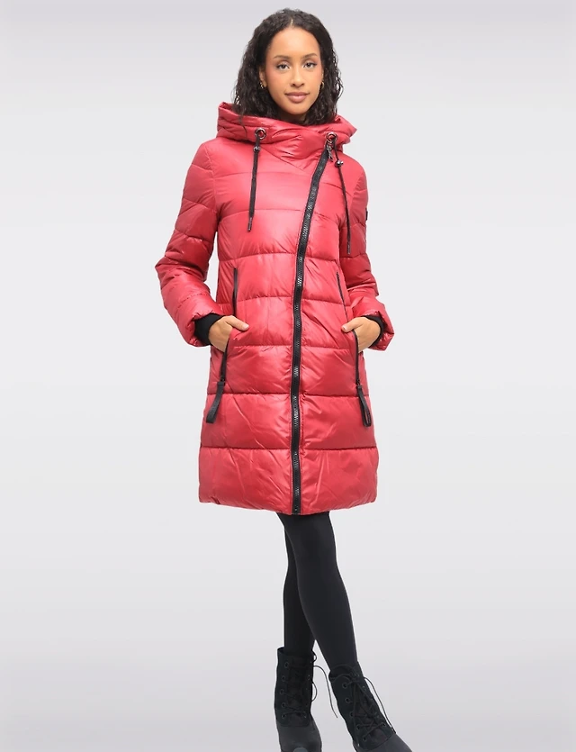 Eco-friendly Asymmetrical Zipper Hooded Long Glossy Ciré Puffer Coat by LOOP