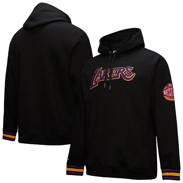 Men's Mitchell & Ness Black Los Angeles Lakers Chainstitch Applique Vintage Heavyweight Pullover Hoodie