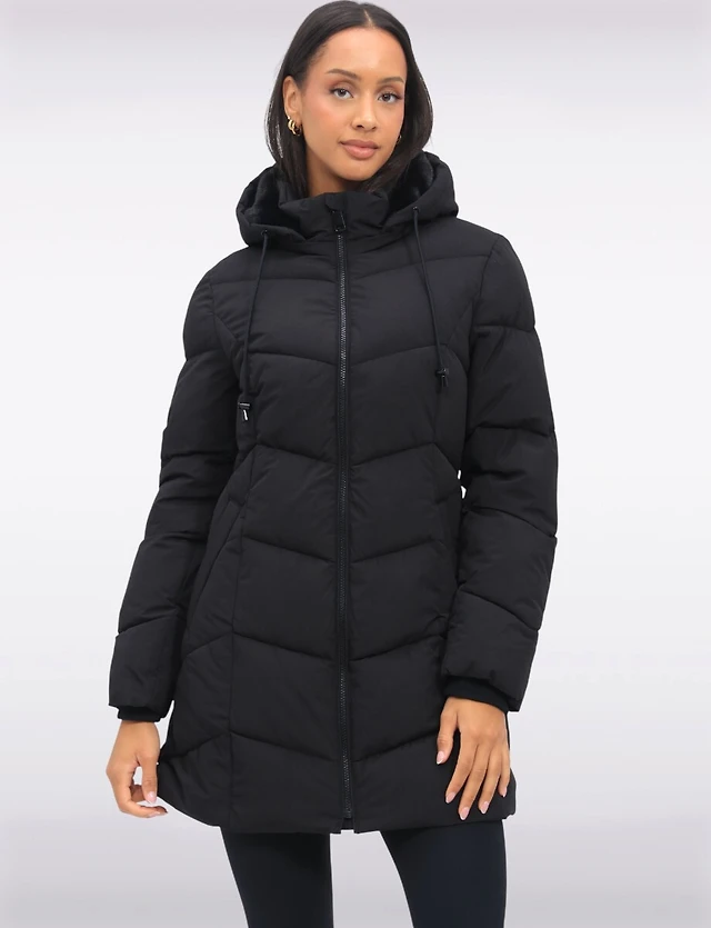Chic Vegan Hooded Puffer Jacket with Bib Round Hem & Drawstring Sides by Snoboll