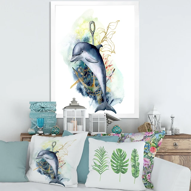 Dolphin Turtle Anchor & Linear Coral Reef Plants Canvas Wall Art Print