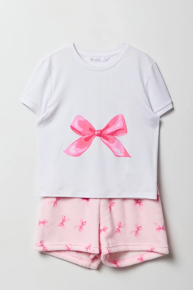 Girls Graphic Tee & Plush Short Pajama Set