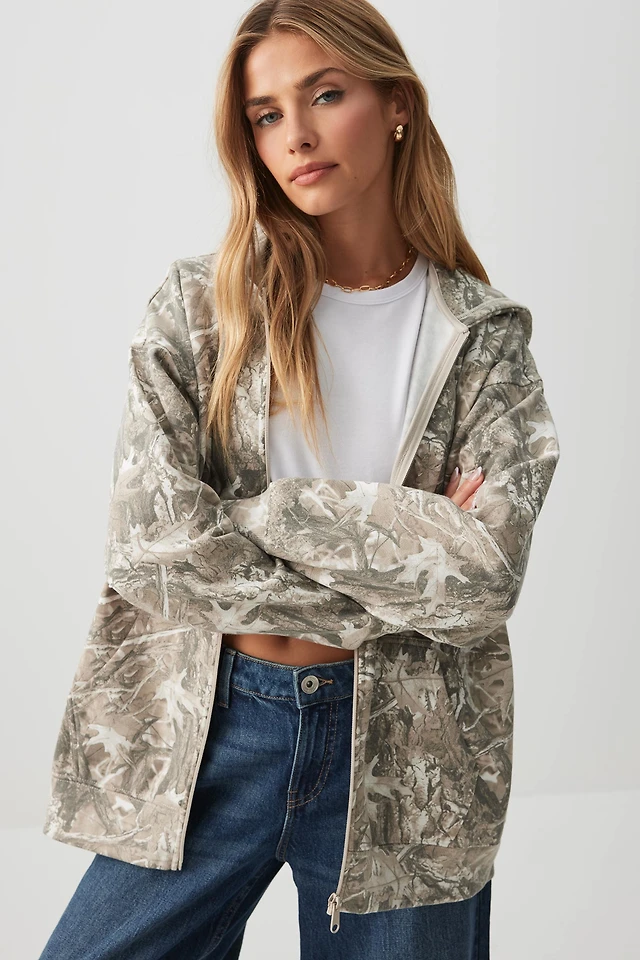 Ardene Camouflage Oversized Zip Up Hoodie in Beige | Size | Polyester/Cotton | Fleece-Lined