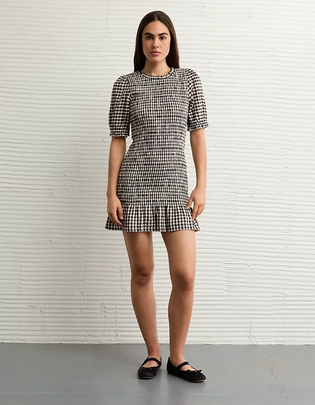 AE Puff Sleeve Tie Front Plaid Mini Dress
