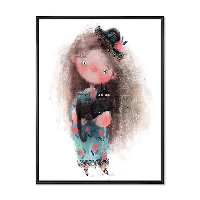 Cute Little Girl with Hat and Black Cat Canvas Wall Art Print