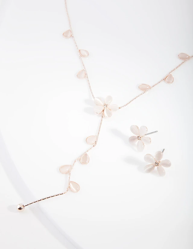 Rose Gold Pearl Flower Necklace & Earrings Set