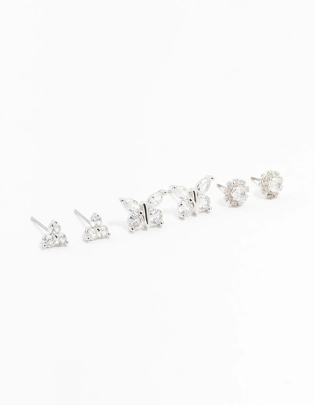 Silver Cubic Zirconia Butterfly Stud Earrings 3-Pack