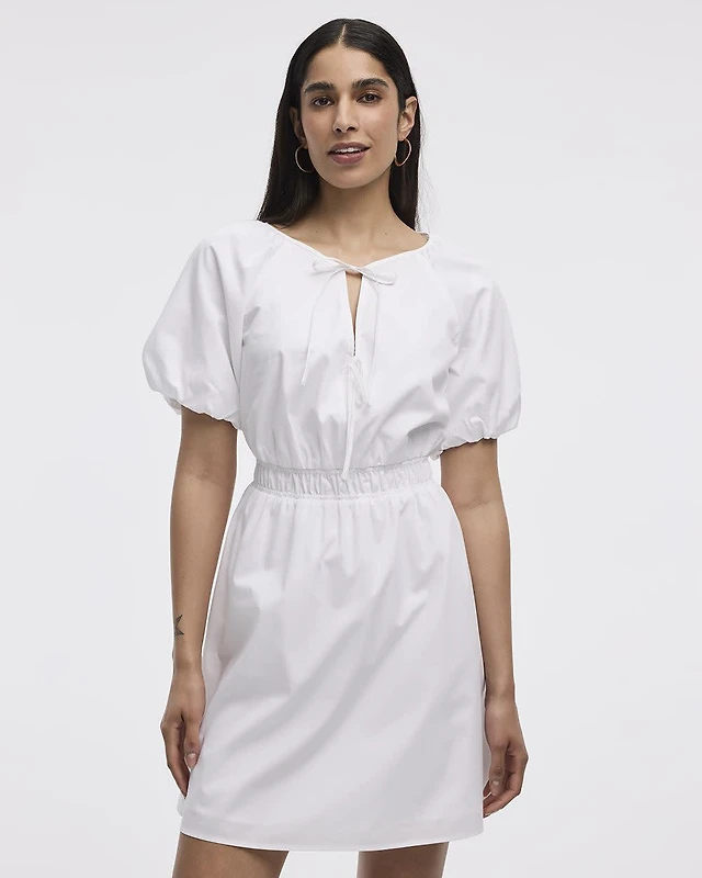 Short-Sleeve Fit-and-Flare Dress with Self-Tie Details at Neckline
