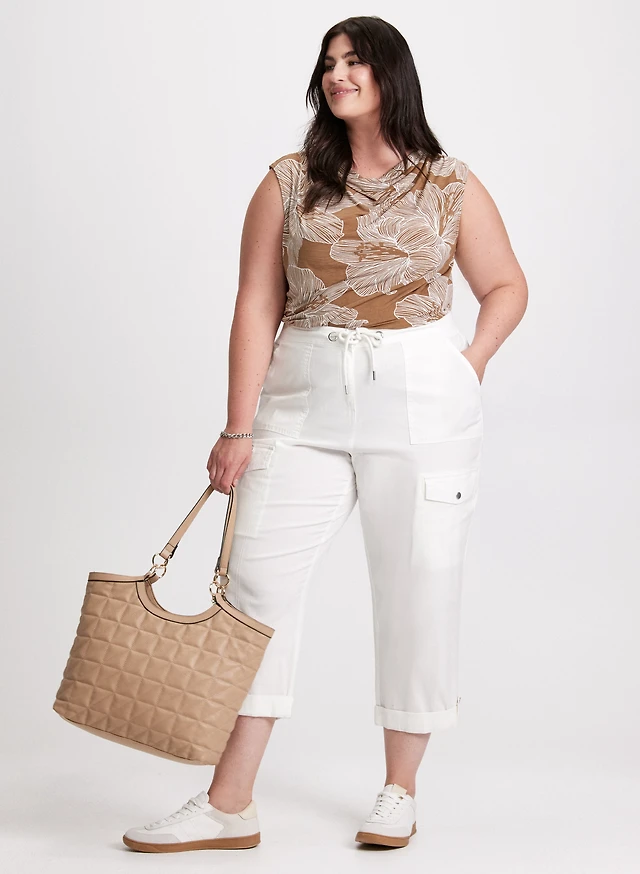 Haut floral à col bénitier et capri à poches cargo