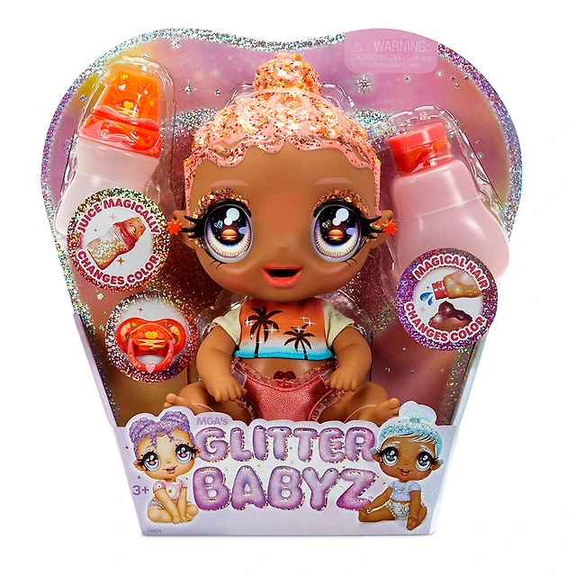 Poupon GLITTER BABYZ Solana Sunburst avec 3 changements de couleur magiques / poupée aux cheveux corail avec coucher de soleil tropical sur la tenue et couche réutilisable, biberon et sucette