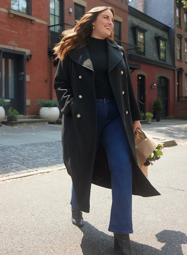 Manteau à capuchon et jean à jambe droite