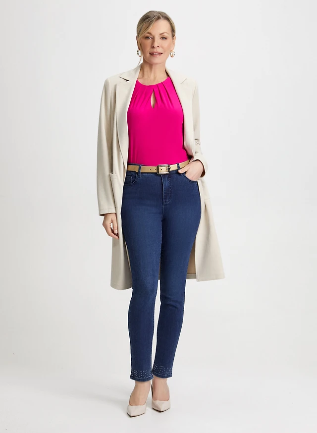 Veste-manteau à motif carreauté et jean à jambe évasée
