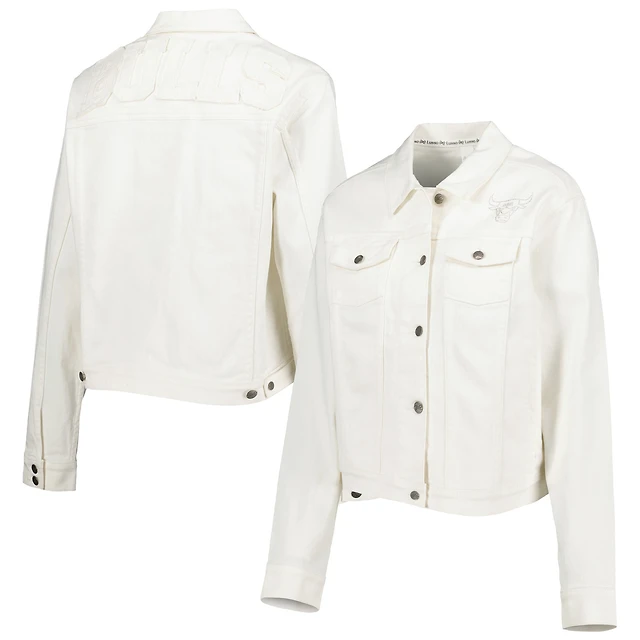 Veste en jean boutonnée Lusso White Chicago Bulls pour femme avec cristaux Swarovski et effet usé