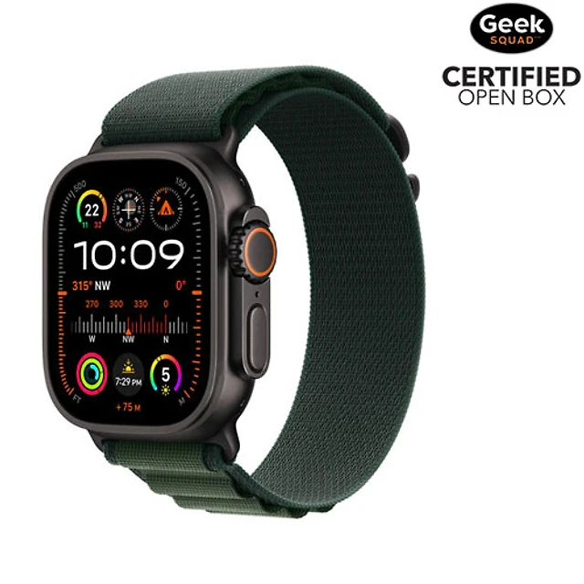 Boîte ouverte - Apple Watch Ultra 2 (GPS + cellulaire) avec boîtier de 49 mm en titane noir et bracelet alpin vert foncé - Grand