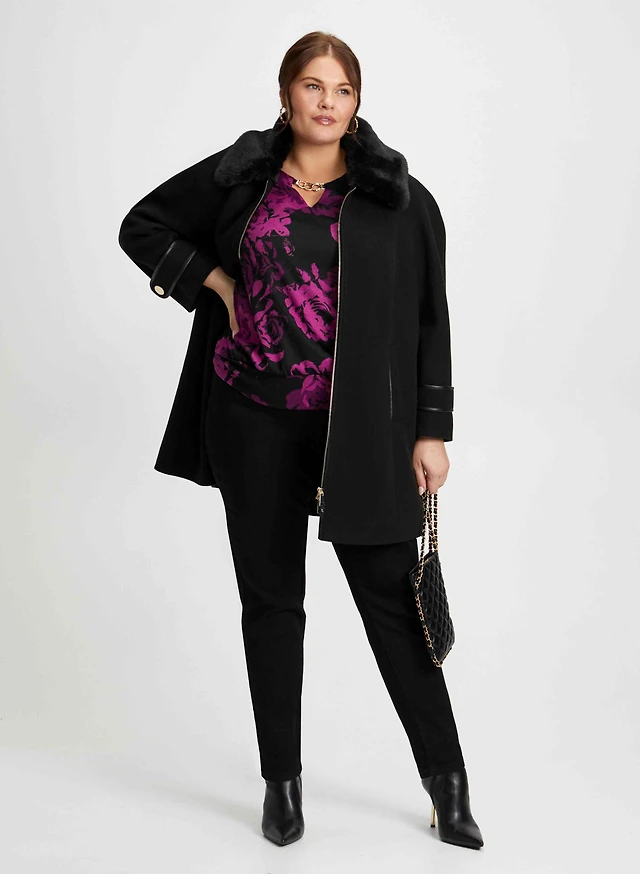 Manteau mi-long avec haut fleuri et jean étroit