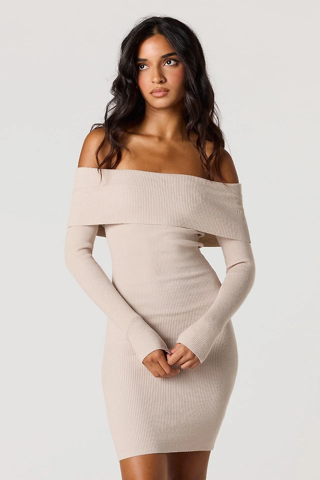 Minirobe côtelée à épaules dénudées et manches longues