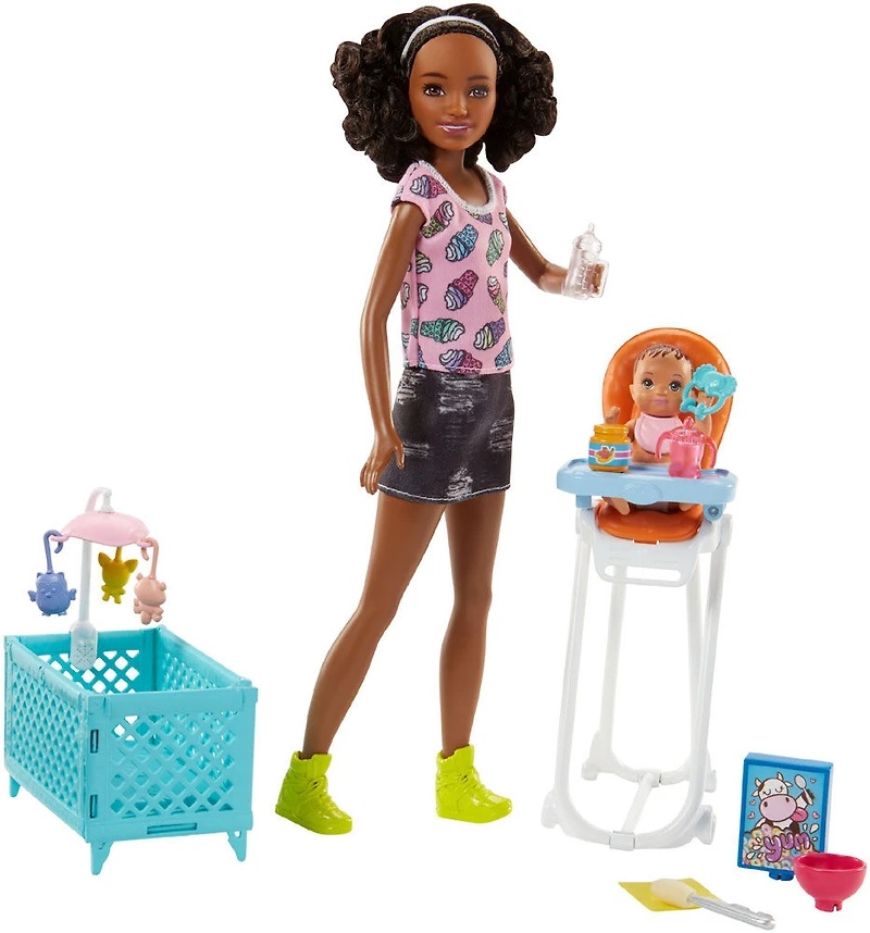 Inventez de belles histoires de baby-sitting avec le coffret Barbie Baby-sitter Ce coffret comprend une poupée baby-sitter, un bébé et des accessoires sur le thème du repas et de la sieste de bébé, dont une chaise haute et un berceau