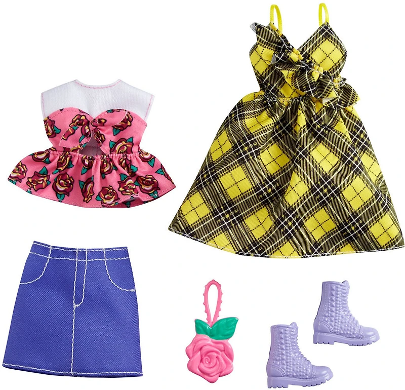 Coffret Tenues Barbie avec 2 tenues pour la poupée Barbie, comprend robe à carreaux jaune, haut floral, jupe en denim et 2 accessoires