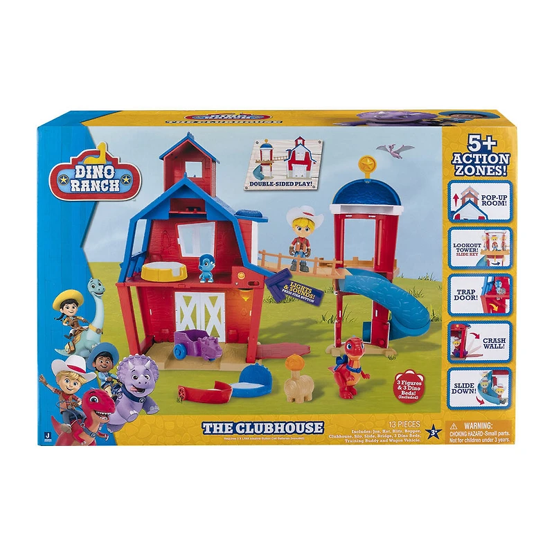 Notre exclusivité; uniquement disponible chez Toys R Us Canada. Bienvenue au Pavillon de Dino Ranch! Ce grand jeu modulaire est doté de lumières et de sons. Rejoins Jon au Pavillon, l'endroit où lui et le reste des Dino Rancheurs se retrouvent pour des aventures quotidiennes. L'ensemble de jeu Dino Ranch comprend une grange rouge vif, ainsi qu'une figurine de 7,6 cm de Jon, et son meilleur ami, Blitz le vélociraptor, et Bopper, le malicieux Dino-Mite qui doit son nom au fait qu'il aime frapper les choses avec sa tête! Commence à t'amuser en t'entrainant comme un dino : place Jon sur l'accessoire citrouille d'entraînement pour apprendre à monter un dino! Ensuite, entre dans le Pavillon pour découvrir ses nombreuses caractéristiques. Par exemple, le toit s'étend. Place Jon à l'intérieur et pousse-le vers le bas pour trouver la trappe sur le sol à l'intérieur de la grange! Tu peux même faire tomber le mur d'effondrement de l'intérieur. Active des sons et des phrases lorsque tu appuies sur le bouton étoile pour allumer la lampe à huile! Place Jon sur le balcon et déplace-le d'un côté à l'autre pour surveiller tout le Dino Ranch. Lorsque la journée est terminée, il y a des lits de dino où Blitz et Bopper peuvent dormir. Crée ton propre terrain de jeu avec toutes les figurines, véhicules, jeux, peluches, stores et plus de la série télévisée à succès pour enfants!