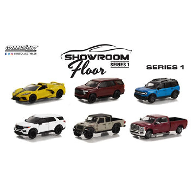 1:64 Showroom Floor est une collection de modèles de concessionnaires automobiles anciennes et neuves avec des autocollants de fenêtre d'origine, des caractéristiques et d'autres informations officielles sur les véhicules. Carrosserie et châssis 100% métal moulé sous pression avec des accents chromés et des pneus en caoutchouc reala. Emballage à thème authentique. Assorti; le style que vous recevrez variera.