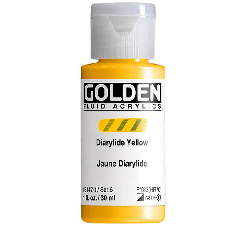 Ayant la même intensité que les acryliques Heavy Body à haute viscosité de GOLDEN, les acryliques Fluid offrent un aspect uniforme et fluide qui convient à des travaux détaillés au pinceau, des glacis, des teintures, des techniques à l'eau et bien plus encore. Vous pouvez mélanger les acryliques Fluid avec le médium pour aérographe GOLDEN pour une application à l'aérographe, y compris sur les textiles. Elles se mélangent facilement à toutes les couleurs acryliques et teintent aisément les gels, les médiums et les apprêts. Les acryliques Fluid de GOLDEN sont fabriquées en chargeant un liant polymère acrylique avec des niveaux concentrés de pigments de qualité, et ce, afin d'obtenir une large sélection de couleurs permanentes et résistantes à la lumière. Aucun agent de remplissage ou d'extension n'est ajouté pour obtenir la consistance souhaitée, et la qualité fluide n'est pas non plus obtenue par l'ajout d'eau. Les acryliques Fluid ont la même charge de pigments que les acryliques Heavy Body à haute viscosité GOLDEN, mais avec une viscosité similaire à celle de la crème épaisse. Les acryliques Fluid permettent des applications fluides, tout en conservant une intensité de couleur, une force de coloration, une intégrité de film et une bonne adhérence.