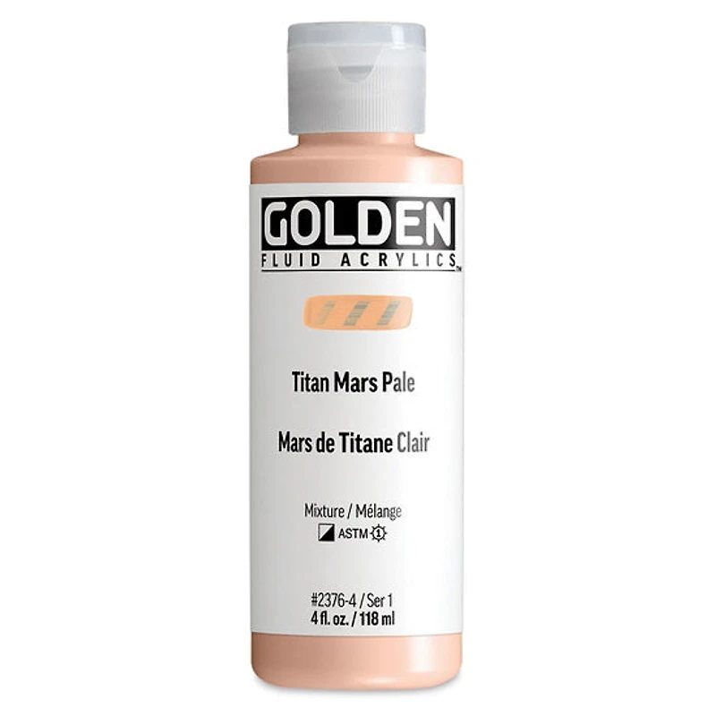 La peinture acrylique fluide Golden – Mars Titane Clair S1 (4?oz) offre une couleur opaque et intense grâce à une forte concentration en pigments de qualité professionnelle, comparable à celle des acryliques Heavy Body de Golden. Formulée sans charges ni agents de remplissage, elle garantit une couleur pure et durable, stable à la lumière. Sa consistance fluide, semblable à une crème épaisse, permet une application souple et uniforme. Contrairement aux mélanges de peinture épaisse et d’eau, cette formule conserve une excellente force colorante, une adhérence optimale et une grande souplesse du film une fois sec. Polyvalente, cette acrylique fluide est idéale pour le pinceau, l’aérographe, les coulées, les lavis et les effets de teinture. Elle se mélange facilement avec les autres couleurs Golden, les gels, médiums, gessos et apprêts, et peut être utilisée sur tissu. Pour les applications en pulvérisation, elle s’associe parfaitement au Golden Airbrush Medium.