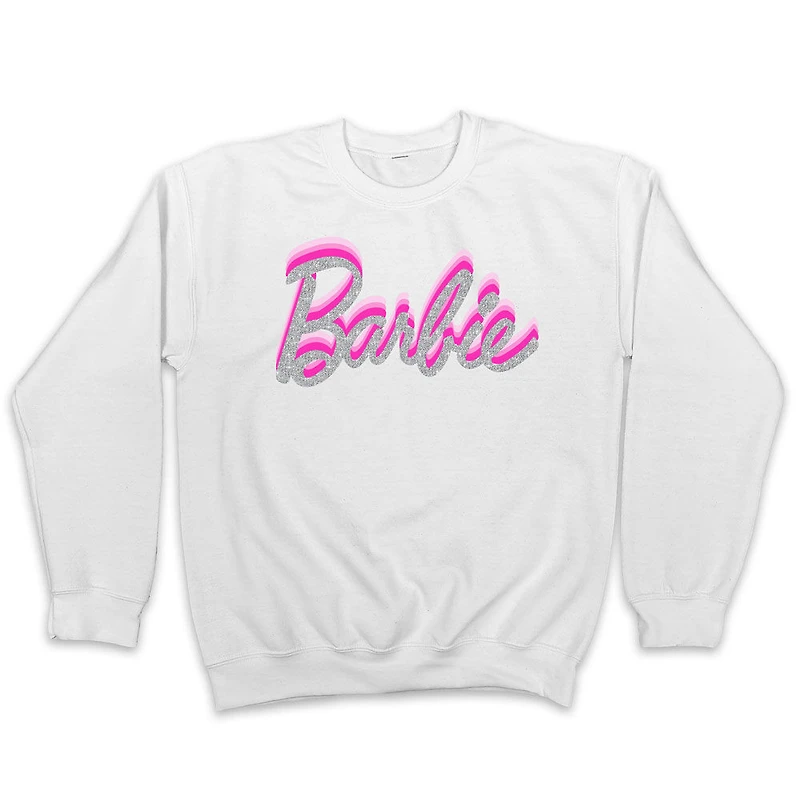 Sweat-shirt ras du cou à manches longues Barbie. Sérigraphie avec paillettes. Lavage en machine à l'eau froide. Polaire 60 % coton/40 % polyester.