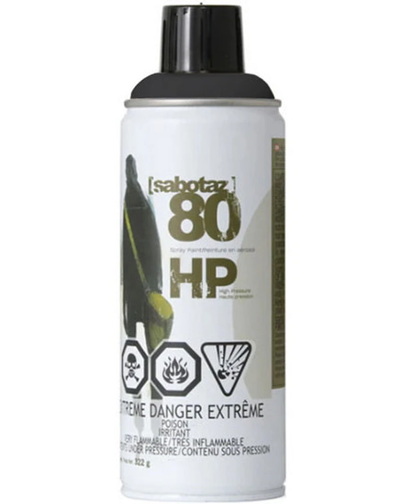 La peinture en aérosol HP (haute pression) Sabotaz 80 est offerte en fini mat ou métallique et offre un vaste choix de couleurs. La buse haute pression permet de peindre rapidement de grandes surfaces ; elle offre un pouvoir couvrant supérieur et grand volume de production. La peinture en aérosol peut être utilisée à l’intérieur ou à l’extérieur et s'applique sur plusieurs supports. Vendue en exclusivité au Canada chez DeSerres, c’est un produit à découvrir ! • Nouvelle formule• Adhérence amélioréeInitialement destinée à l’univers des graffiteurs, Sabotaz 80 s'adapte à de nombreux usages et s’applique très facilement sur une multitude de supports : plastique, métal, bois, cuir, textile et plus encore. Étonnante, la peinture en aérosol Sabotaz peut être utilisée pour réaliser des projets créatifs. Un produit de qualité qui offre un grand pouvoir couvrant en une seule couche. Spécifications :• La peinture est sèche au toucher 10 minutes suivant l’application• Utiliser à l’extérieur ou dans un espace bien ventilé• Protéger votre visage avec un masque• Tenir hors de portée des enfants• Produit inflammable• Secouer vivement l’aérosol avant son utilisation • Peindre en maintenant l’aérosol en position verticaleUn détaillant responsableCompte tenu que le contenu en aérosol des produits Sabotaz est nocif pour la santé, et afin d’éviter des situations dangereuses, la direction de DeSerres juge qu'il est de sa responsabilité de réserver la vente de ces produits au plus de 18 ans. Une carte d’identification avec photo à l’appui pourrait être demandée.