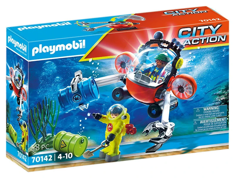 Accompagnez les plongeurs lors d'une expédition environnementale à bord du bateau de plongée et aidez-les à rechercher des matériaux suspects au fond de l'océan. Utilisez les bras de préhension pour ramasser soigneusement les barils dangereux et les transporter en toute sécurité à la surface. Combinez cet ensemble avec le reste du thème PLAYMOBIL Sea Rescue (#70140- 70145 - vendus séparément) pour encore plus d'aventures !