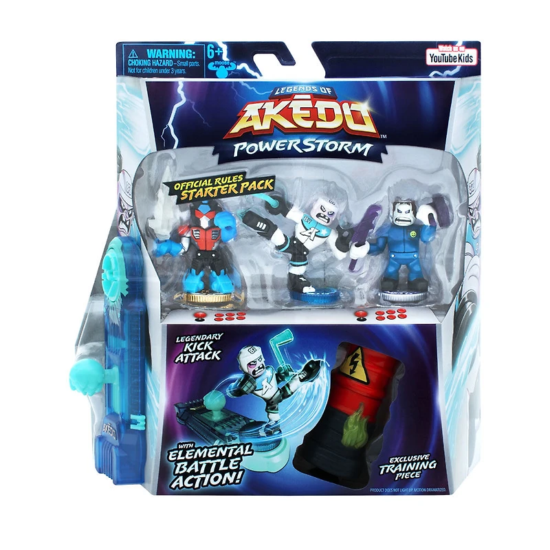 Les légendes d'Akedo sont de retour et prêtes pour une """"action de combat élémentaire"""" avec Legends of Akedo Power Storm ! Renforcés avec des pouvoirs élémentaires, les guerriers Akedo sont prêts au combat avec de nouvelles armes, de nouveaux styles de combat et une jouabilité ! Les joueurs peuvent désormais se préparer au combat avec le pack de démarrage Legends of Akedo Power Storm. Les enfants peuvent s'entraîner pour devenir une légende d'Akedo et développer leurs compétences avec la pièce d'entraînement bonus - The Flame Strike Barrel. Il est parfait pour préparer leurs guerriers au match alors qu'ils perfectionnent l'ultime Split Strike Le pack de démarrage comprend 3 guerriers Akedo : Recharge, Rip Off et un guerrier légendaire avec une véritable action de coup de pied - High Stick ! Ce guerrier génial peut délivrer une Frappe Fractionnée avec son coup puissant. Placez vos guerriers sur le joystick exclusif du pack et entraînez votre équipe pour une action de combat de niveau supérieur ! Il y a 42 nouveaux guerriers de combat que les joueurs peuvent collectionner et combattre tout au long de la série Power Storm. De plus, chaque guerrier combattant est renforcé par l'un des six éléments : Terre, Feu, Eau, Lumière, Ombre et Foudre ! Désormais, les enfants peuvent utiliser leurs guerriers """"Elemental Battle Action"""" pour effectuer la parfaite """"Split Strike"""" ! Il y a des guerriers classiques, épiques, ultra rares, légendaires et """"Super Splitters"""" à collectionner ainsi que de nouveaux contrôleurs de combat.