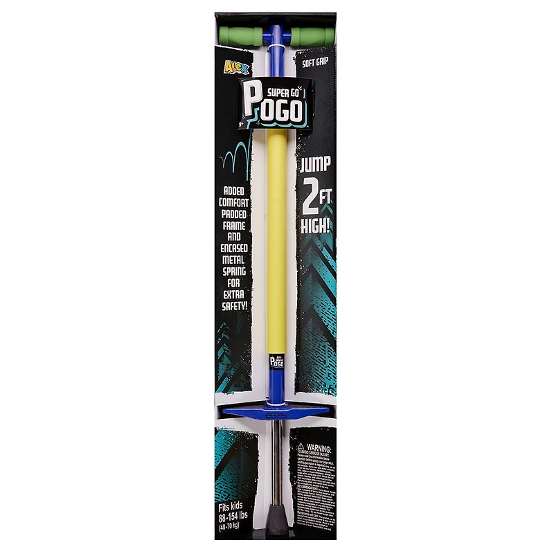 ALEX Active Super Go Pogo - Blue est le pogo stick pour pratiquer vos tours de pogo ! Parfait pour les enfants de 88 à 154 lb (40 à 70 kg), votre bébé rebondissant peut sauter jusqu'à 2 pieds (0,6 m) de haut ! Cadre rembourré pour plus de confort, pied en caoutchouc large pour la stabilité, ressort métallique encastré pour la sécurité et poignées souples. Recommandé pour les enfants de 9 ans et plus. N'oubliez jamais d'utiliser un équipement de sécurité.