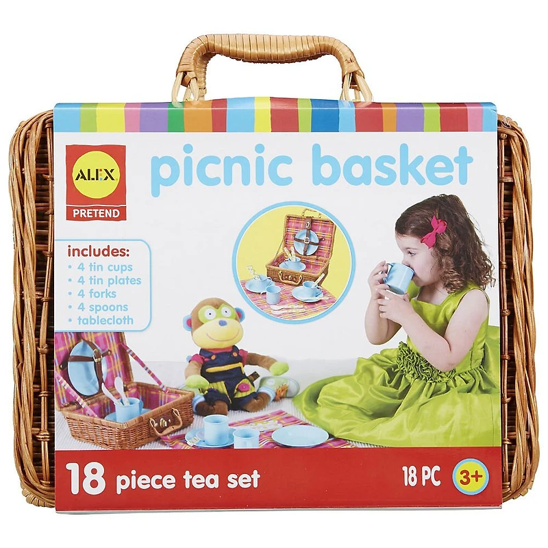 Service à thé de 18 pièces. Comprend 4 gobelets en étain, 4 assiettes en étain, 4 cuillères en plastique, 4 fourchettes en plastique, nappe et panier en osier.