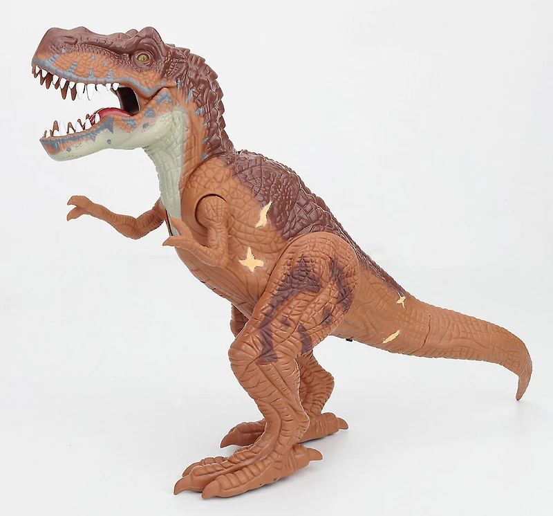 Notre exclusivité, uniquement chez Toys"R"Us. Il grogne, rugit, piétine et gronde! Vos enfants n'auront qu'à toucher son ventre, son dos ou sa queue et il s'animera, prêt à traquer sa proie. L'incroyable tyrannosaure rex était le roi tyran lézard de l'ère préhistorique. Atteignant une hauteur de près de 40 pieds et pesant jusqu'à huit tonnes il pouvait facilement attraper sa proie grâce à ses bras courts, mais puissants.
