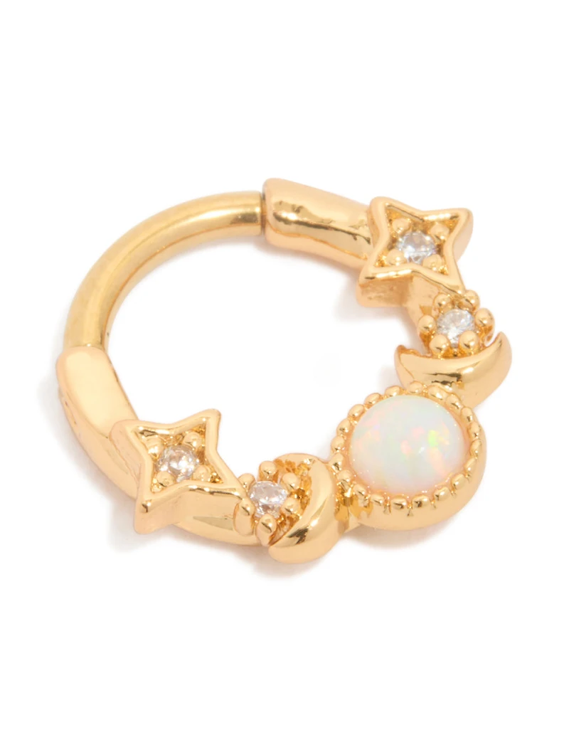 Brillez comme le ciel nocturne avec cette bague à clic en opale céleste en titane plaqué or. Cette bague à clic stylée ajoute une ambiance céleste et rêveuse à n’importe quelle pile d’oreilles, avec un centre opale lumineux qui capte magnifiquement la lumière. Idéal comme anneau à clic pour des piercings daith, conque, rook, helix, ajustés ou anti-tragus, il est parfait pour le quotidien, les festivals ou les sorties nocturnes. Associez ce clicker céleste à de simples cerceaux dorés, des clous délicats ou d’autres bijoux en opale pour un look soigneusement soigné, à la mode, à la fois moderne et magique. Matériau : Plaqué or, opale, titane Couleur : Or, transparent Dimensions : Longueur de conception avant 14 mm x Largeur de conception avant 13 mm Écartement : 16g / 1,2mm Longueur du poteau : 8 mm