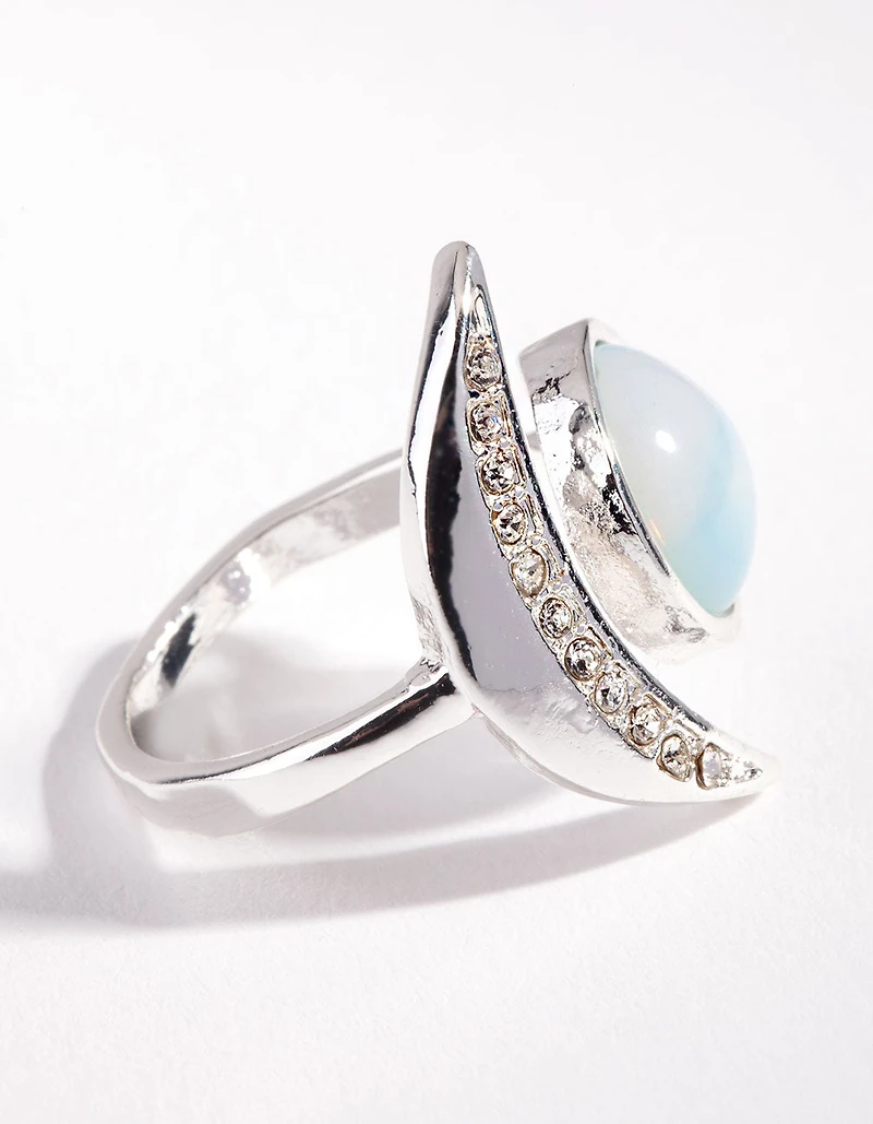 Un motif céleste en croissant de lune est mis en valeur à travers cet anneau ouvert aux tons argentés.