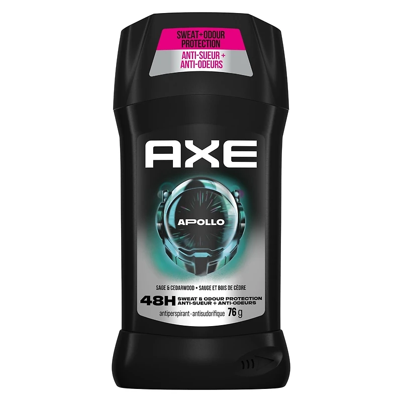 - L’antisudorifique en bâton pour homme AXE Apollo vous garde frais et au sec en toute confiance avec sa protection antibactérienne contre les odeurs;Anti-sueur, sens frais avec notre nouvel antisudorifique pour homme avec une formule avancée;Un antisudorifique au parfum irrésistible. Laisse le combo iconique de sauge fraîche et bois de cèdre te garder frais et au sec toute la journée;L’antisudorifique en bâton pour homme AXE Apollo offre une protection anti-odeurs et anti-sueur de 48 heures;Appliquez le déodorant pour homme sur des aisselles propres et sèches pour un effet instantané.;Vous aimez ce parfum? Découvrez le vaporisateur à sec, le déodorant, le nettoyant corporel et le shampoing revitalisant 2 en 1 AXE Apollo.