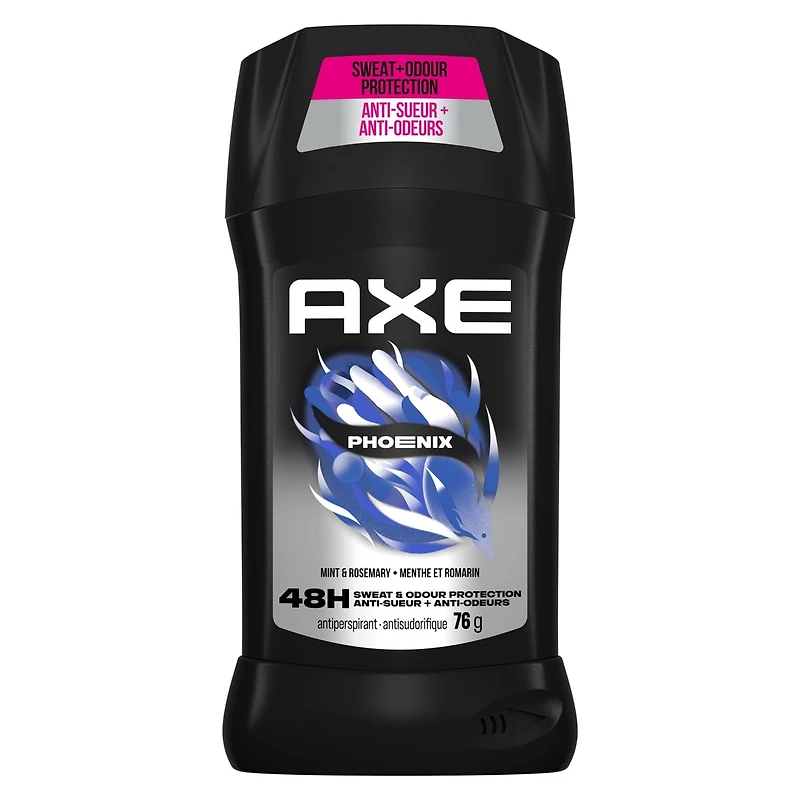 - Le déodorant antisudorifique en bâton pour homme AXE Phoenix offre une protection anti-odeurs et anti-sueur de 48 heures pour vous garder frais et au sec en toute confiance.;Sens frais avec l’antisudorifique en bâton Axe pour homme et sa protection anti-sueur avancée.;Un antisudorifique au parfum irrésistible et revitalisant en menthe et romarin qui te garde frais et au sec toute la journée.;La crème anti-sueur du déodorant pour homme est invisible.;Applique ce déodorant en bâton anti-sueur sur des aisselles propres et sèches pour un effet instantané.;Vous aimez cet antisudorifique? Découvrez le vaporisateur à sec, le nettoyant corporel et le shampoing et revitalisant 2 en 1 AXE Phoenix.