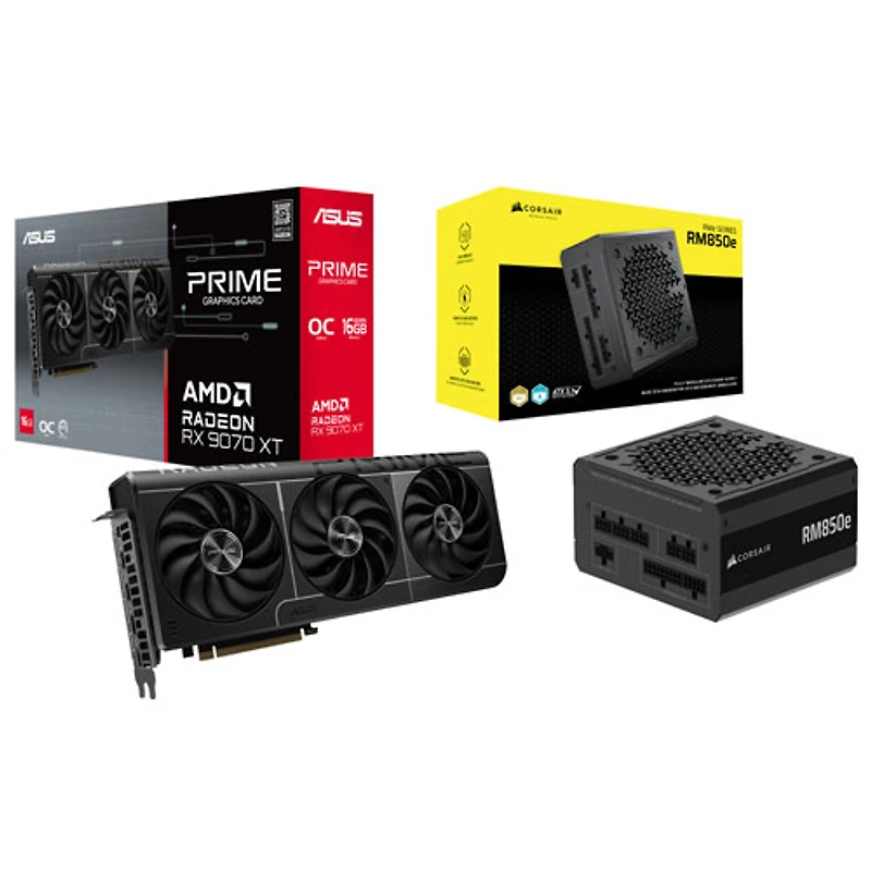 Boost your CPU's power with the ASUS Prime Radeon RX 9070 XT OC video card and CORSAIR RMe Series 850W power supply bundle. Equipped with advanced Axial-tech fans and a phase-change GPU thermal pad, the graphics card offers optimal cooling and performance. The power supply has a fully modular design which keeps your build neat by only connecting the needed cables.