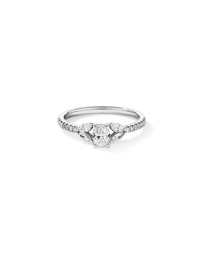 Bague en or blanc 14 carats ornée d'un diamant latéral rehaussé, serti de diamants ovales, ronds brillants et marquise d'un poids total de 0,59 carat. Un modèle unique et symbolique de notre collection Evermore, conçu pour être conservé précieusement.