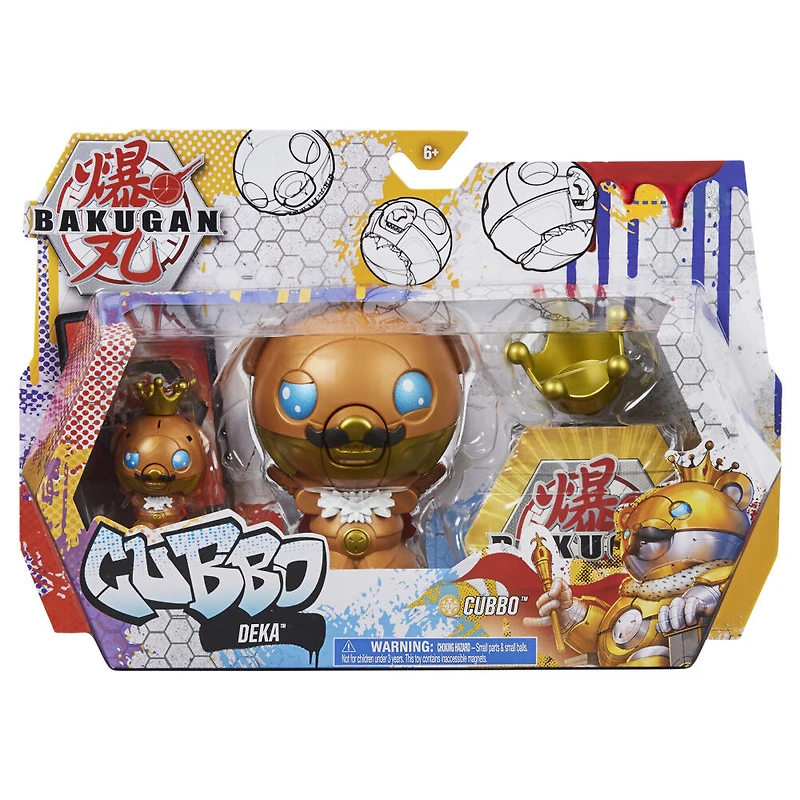 Ce personnage haut en couleur s'apprête à conquérir le monde. Ne vous fiez pas au côté mignon de Cubbo, car il a une attitude féroce et des capacités redoutables sur le champ de bataille. Exclusivité Target, le coffret Cubbo Deka comprend deux personnages Cubbo roi et leur accessoire, deux BakuCores et une carte Personnage. Il comporte tout ce dont vous avez besoin pour bondir au coeur de l'action. Faites rouler votre Bakugan Cubbo unique sur les BakuCores en métal pour assister à une Baku-Action surgissante. Avez-vous les qualités nécessaires pour devenir le maître Bakugan ultime ? Affrontez vos amis avec vos propres Bakugan Cubbo.