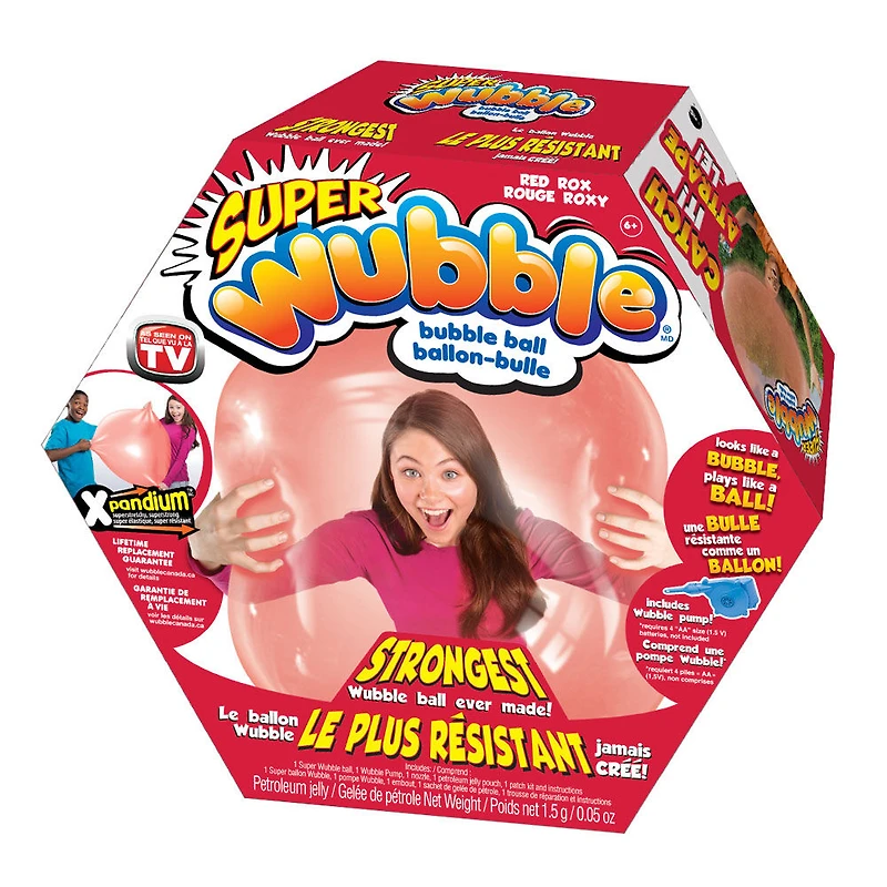 Le ballon-bulle Super Wubble avec pompe ressemble à une bulle qui est résistante comme un ballon. C’est le Wubble le plus résistant jamais créé. Il a l’apparence d’une bulle et se déplace comme une bulle, mais il n’éclate pas comme une bulle! Frappe-le du pied, frappe-le avec la main, lance-le, fais-le rebondir. Il est spongieux, super doux et léger. Idéal pour jouer à l’intérieur et à l’extérieur en toute saison. Il se gonfle en quelques minutes à l’aide de la pompe Wubble incluse. Lorsque vous avez fini de jouer, vous pouvez même dégonfler le ballon-bulle Wubble avant de le ranger. La pompe Wubble requiert 4 piles AA vendues séparément. L’ensemble comprend 1 ballon Wubble, 1 pompe Wubble, 1 embout, 1 sachet de gelée de pétrole, 1 trousse de réparation et des instructions. Pour enfants de 6 ans et plus.