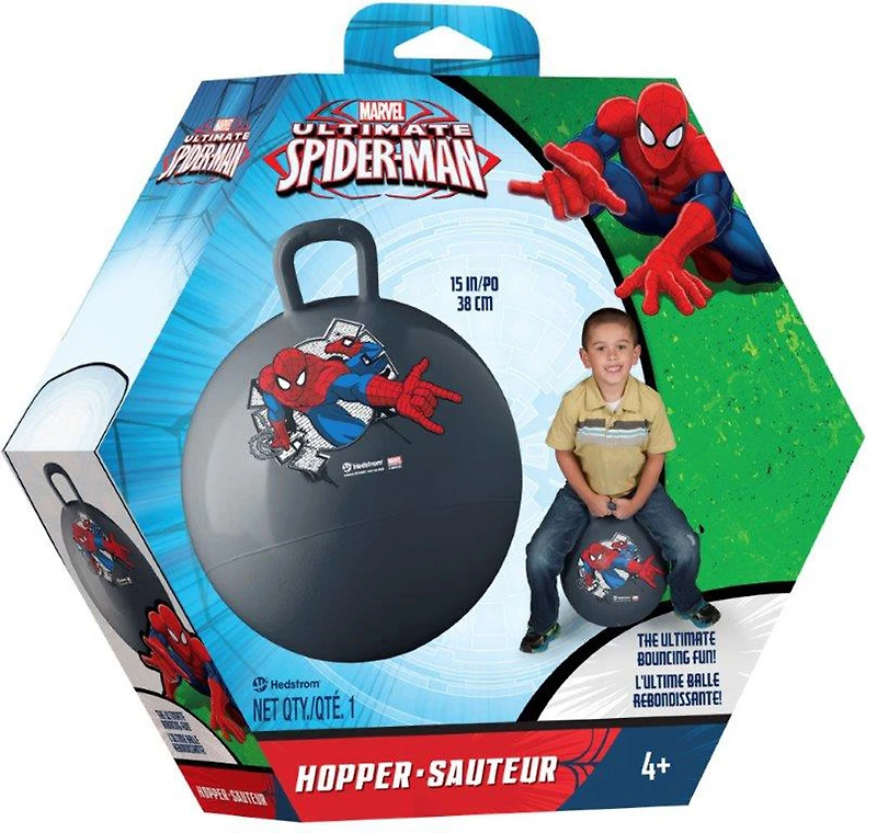Sautez jusqu'à vous laisser tomber sur nos Ballons-sauteur Ultimate Spiderman d'Hedstrom! Ces sauteurs gonflables procurent des heures de plaisir, une activité physique pour les enfants de 4 ans et plus. Ce jouet classique a procuré à des générations d'enfants un excellent moyen d'exercice afin de prendre part à une activité interactive et engageante dont ils profitent maintenant plus que jamais. Ces ballons-sauteur d'Hedstrom sont construits pour durer, de fabrication en vinyle très résistant et dans une grande variété de graphiques. La poignée offre une prise sécuritaire, alors quand ils sautent forts, les enfants peuvent s'y agripper et coninuer de s'amuser. Et, quand il est temps de passer à une autre activité, le Ballon-sauteur peut être dégonflé pour un rangement facile. Puis, regonflez avec une pompe ou avec un gonfleur, et vous êtes prêts! Que vous soyez chez vous ou dans le parc, les Ballons-sauteur d'Hedstrom conviennent pour une utilisation intérieure ou extérieure, et sont faciles à nettoyer, donc les enfants peuvent sauter depuis la cour avant jusqu'au salon avec moins de gâchis. Et avec autant de couleurs et de modèles au choix- il y a un ballon-sauteur pour tous!